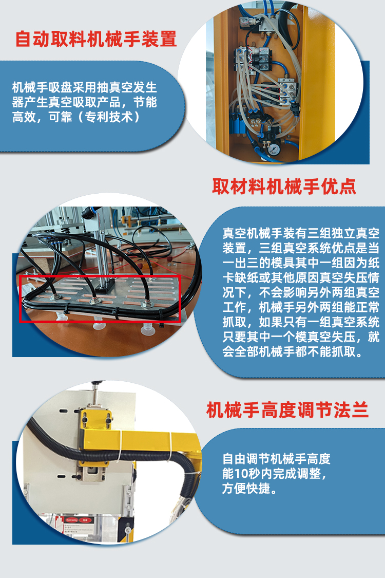 自動(dòng)吸塑封口機(jī)此機(jī)具有機(jī)械手自動(dòng)取料,這樣就可以減少操作人員,代替了人工,(一臺(tái)自動(dòng)的機(jī)器可以節(jié)省半年的人工費(fèi)用) 全自動(dòng)帶機(jī)械手吸塑封口機(jī)比普通吸塑封口機(jī)提高一半工作效率。產(chǎn)量穩(wěn)定,不會(huì)因操作人員的變動(dòng)而使產(chǎn)量降低。