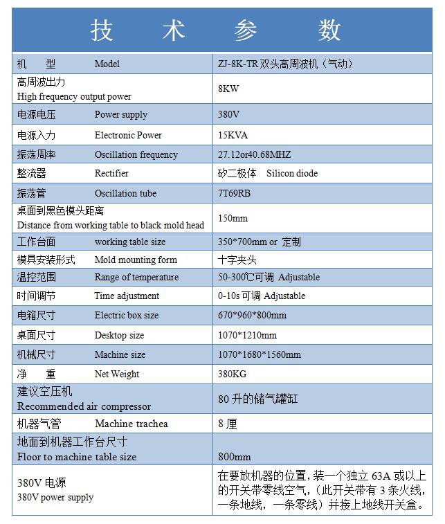 雙頭氣動(dòng)高周波機(jī)壓羽絨標(biāo)型號(hào)為ZJ-8K-TR,此機(jī)裝有防火花保護(hù)裝置,對高周波模具及生產(chǎn)產(chǎn)品起到很大的保護(hù)作用,是一款雙頭腳踩高周波機(jī)機(jī)器質(zhì)量已通過歐盟CE質(zhì)量出口檢測,ISO9001機(jī)器質(zhì)量檢測;并對客戶的樣板提供免費(fèi)打板打樣,傳授產(chǎn)品生產(chǎn)整過程工序及提供生產(chǎn)方案。